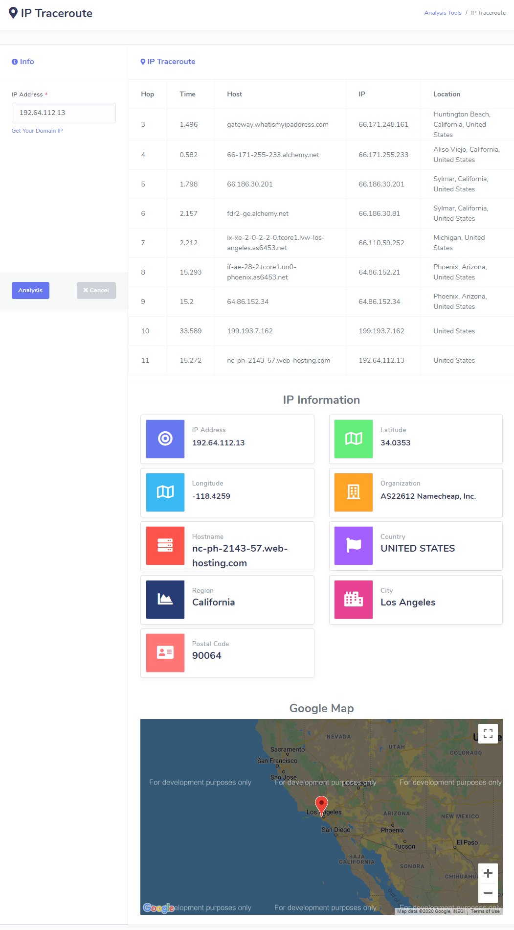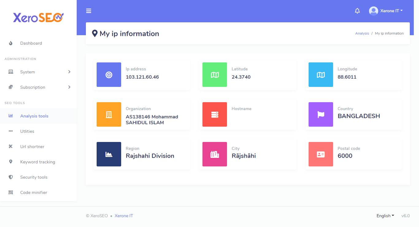 Check your own IP address and your location (latitude, longitude), organization, Region, City, Postal Code, Country.