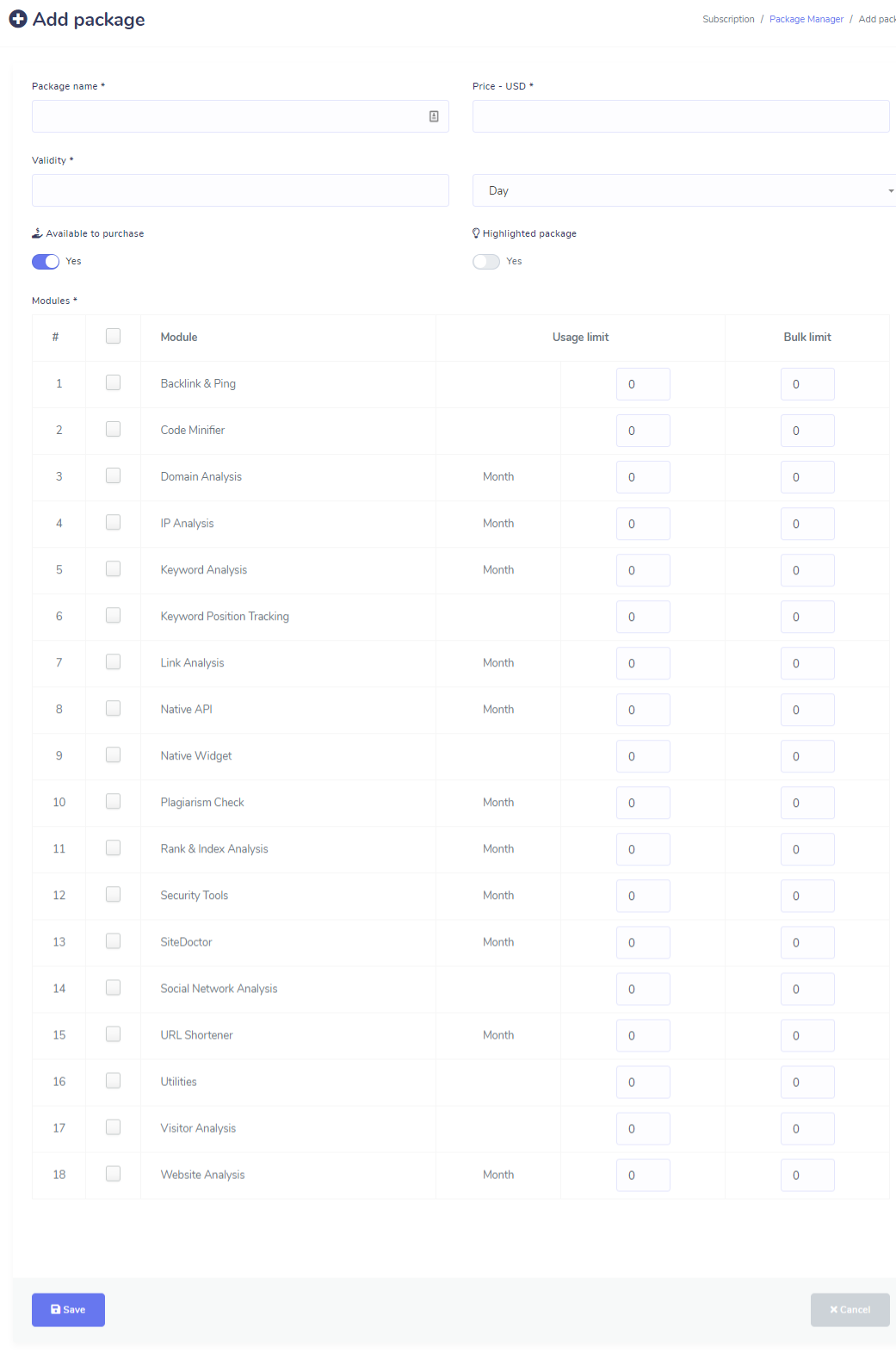 Suppose you want to create a package named "basic" which validity will be 30days, price will be EUR 10 and you want to assign specific modules for this package. In this case you are lucky!! You can add unlimited packages you want including price,validity and modules. You can also put monthly analysis limit each module when you create a package. While you assign limits, 0 (zero) means unlimited