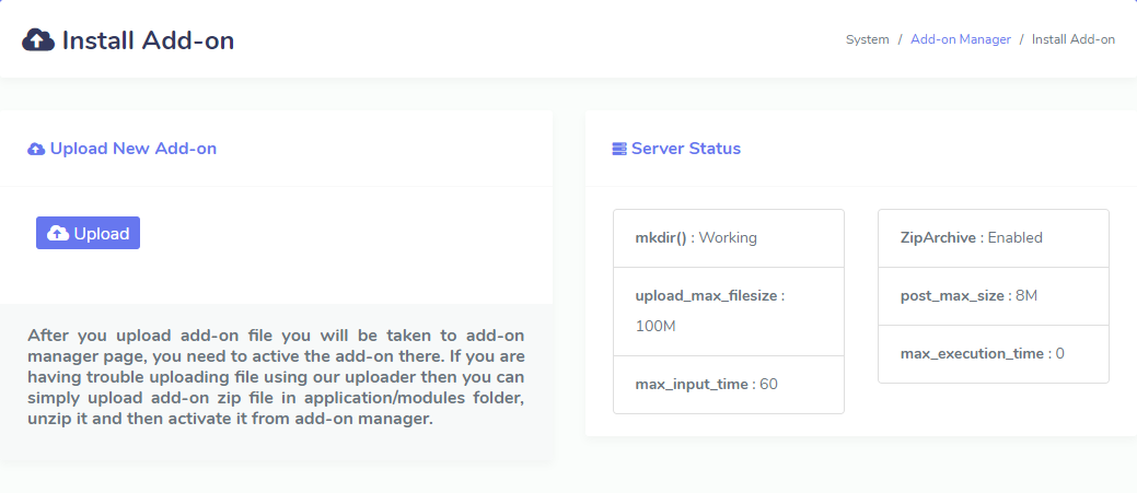 Click on it and you will be redirect to a page where you have to upload your add-on. Next you have to activate your add-on using your add-on purchase code. You can also delete add-on if you wish from the list