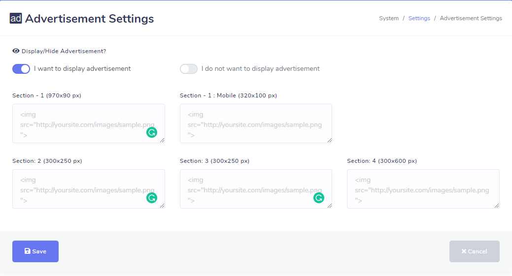 If you choose to show advertise then write html code for each section, as for example you can add simply a html embedded inside a html tag or can add google adsense html code for each section.