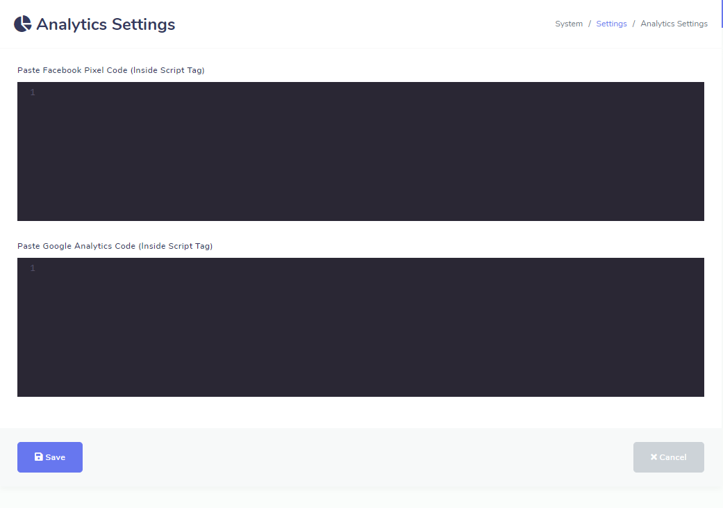 You may need to add analytics scripts like Google analytics or Facebook pixel code in landing page and login page to track visitors. Well we have sorted it out for you. Simply put the js scripts (with script tag) in the textarea and save and system will automatically embed them in landing page as well as login page. You can add multiple scripts in single textarea or can put other js in textarea rather than Google or Facebook scripts if you like.