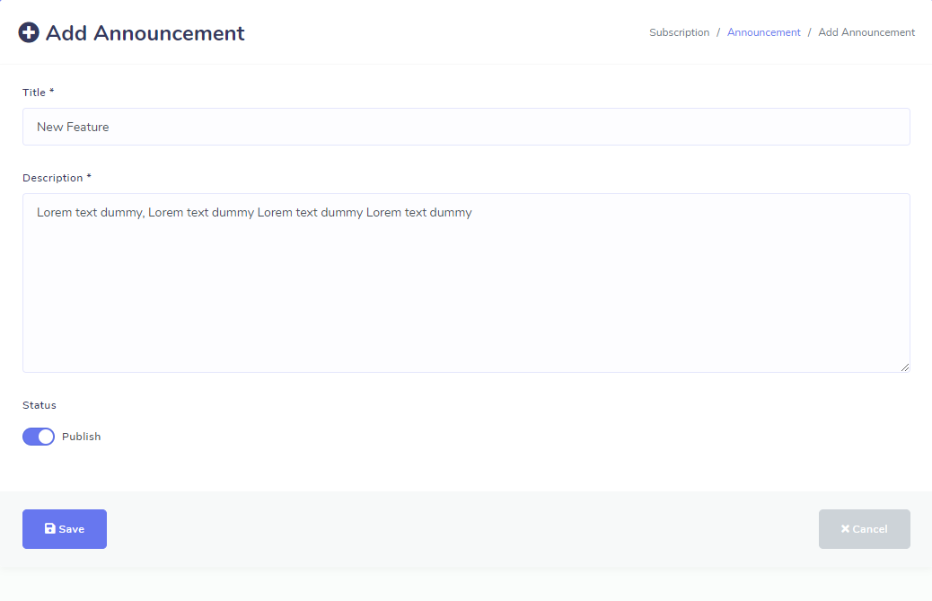 This section of your settings helps you to show notification to all your users using this system. You can create notification by clicking the button New Announcement on the top. This button will redirect you to a new page. There you can create a new notification. You can keep it published or as draft.