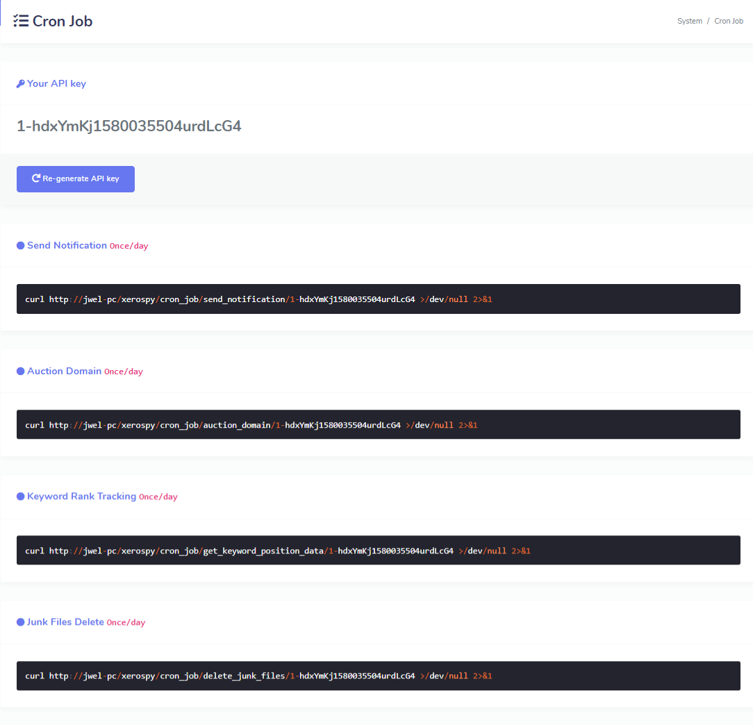 Here all the cron jobs need to setup on server are listed for your application. But first you have to generate api key for your application by clicking the Generate API Key. You can re-generate your applications api key any time but doing this will require to setup cron job on server again. When you mouse over on the cron job commands you will see a text copy on the right side and by clicking on that text you can copy that cron job.