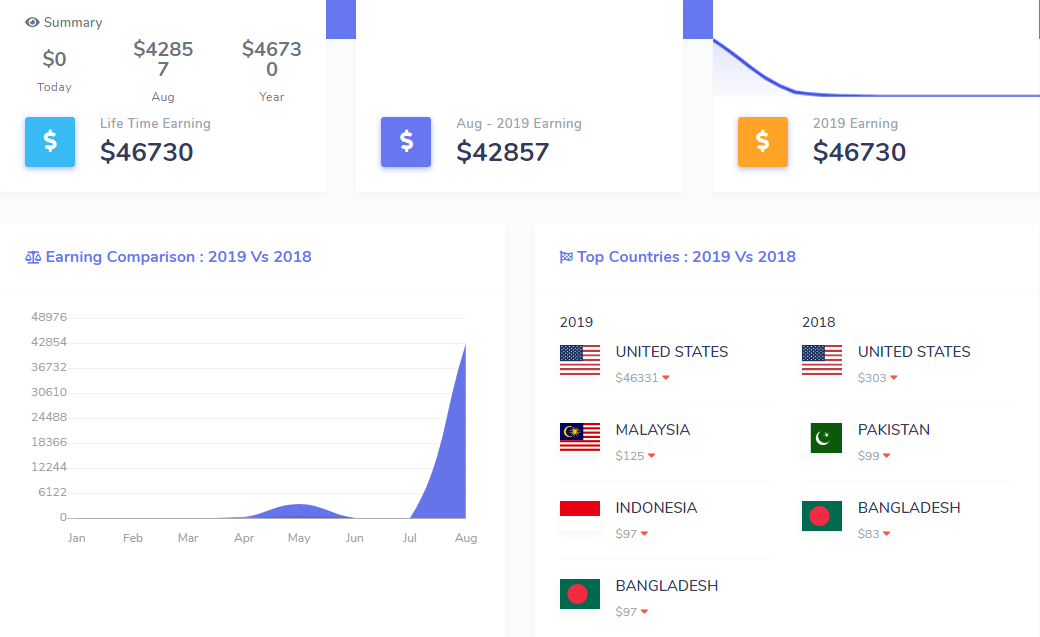This section will show your earning summary. You can see your Life Time Earning, Current Month Earning, Current Year Earning, Earning comparison of consicutive last two years and Top countries of consicutive last two years.