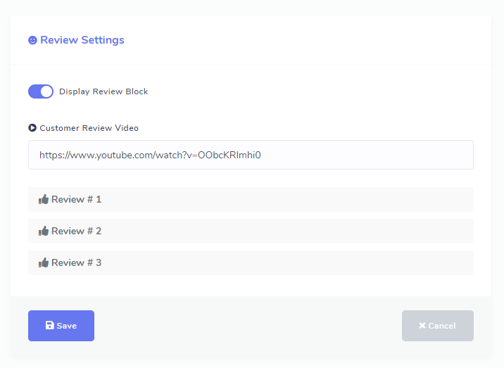 If you choose Display Review Block as No then customer review section will be hidden from landing page. Put youtube watch url if you want to show a review video, keep it blank if you do not want it, it will be hidden then.