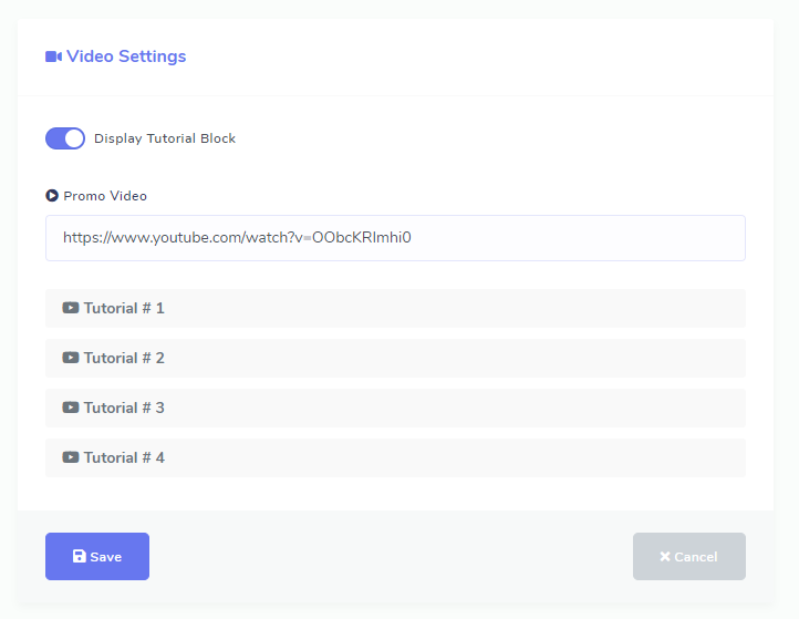 If you choose Display Tutorial Block as No then tutorial section will be hidden from landing page. Put your tutorial title,thumbnail url & youtube watch url to affect the landing page.