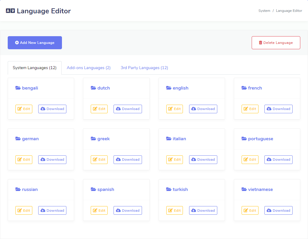 In this section you will find all the languages comes with this applications. You can add your language by clicking the button Add New Language placed on the top. You can also delete your language if you fill necessary.