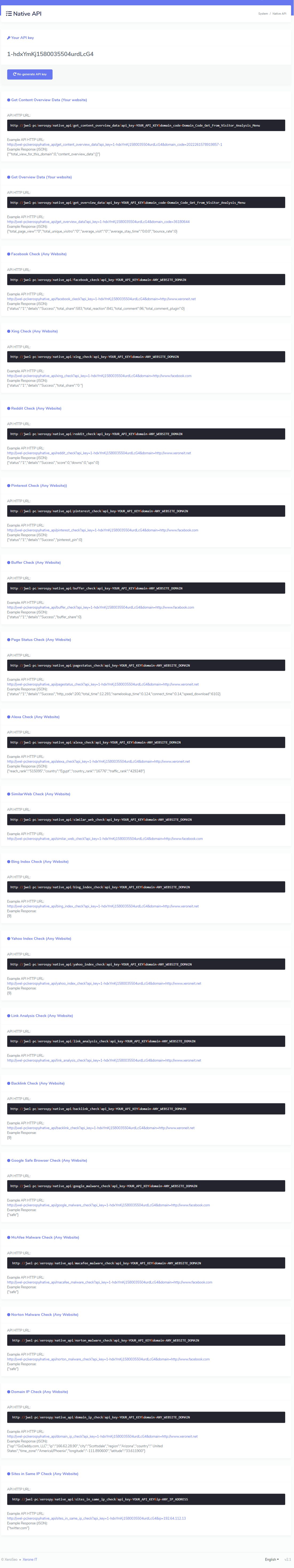 This panel is for developers who want XeroSEO data be integrated with other cool stuffs. We have provided 19 nice and useful APIs. Every user will have his/her own API key. Usage of APIs are described under Native API menu of XeroSEO application.