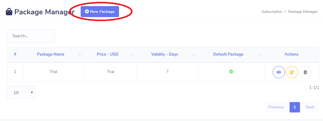 In this section you will find all the packages you have created so far. By default there is a "Trail" package. You can not delete this package. If you do not want a trial then edit deafult package's validity to 0 (zero). If you do not want to take money from users then edit the default package's price to "Free".