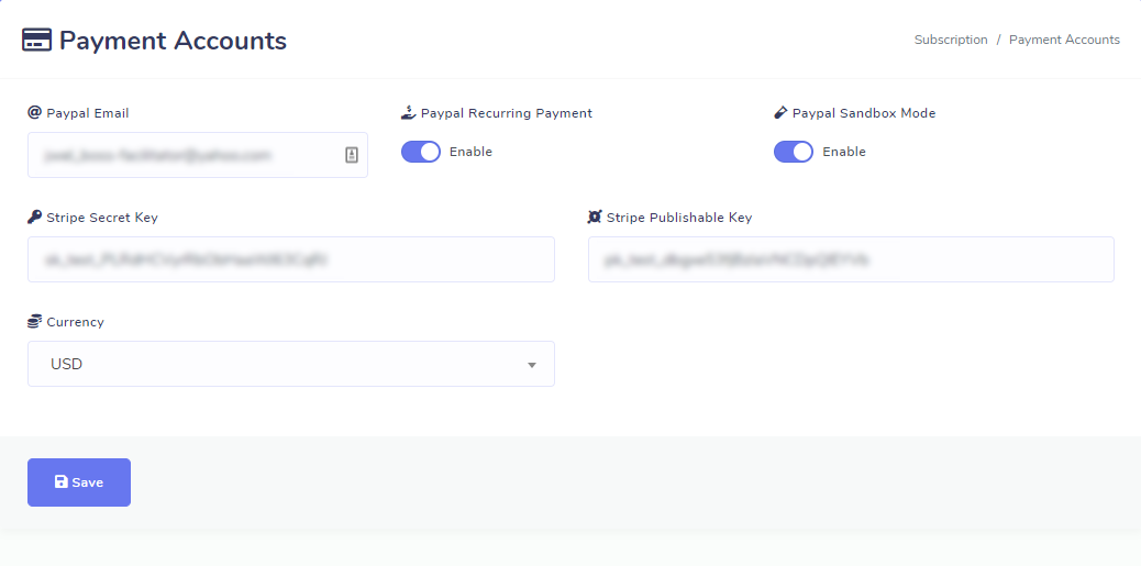 This is the place where you set your PayPal account / Stripe account or both and your currency. Your end users will pay to this PayPal account/ Stripe account. Paypal has recurring payment option. Make sure the paypal method is in live mode (disable sandbox) before you start selling using paypal.