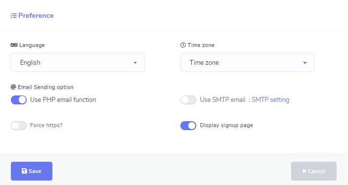 Preference : You can set system email function, it can be php mail or you can setup your smtp profile. You can force to use HTTPS and also can enable disable signup system. You can setup system default time zone and locale.