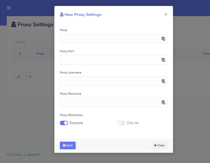 Several XeroSEO features need proxy to work. As an admin you can set proxy for yourself as well as for your end users. Your end users (non admin users) will also can add their own proxy. we recommended this site for proxy https://instantproxies.com/