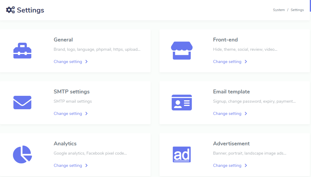 This section offers you to change settings in these sections: General, Front-end, SMTP, Email, Analytics, Advertisement