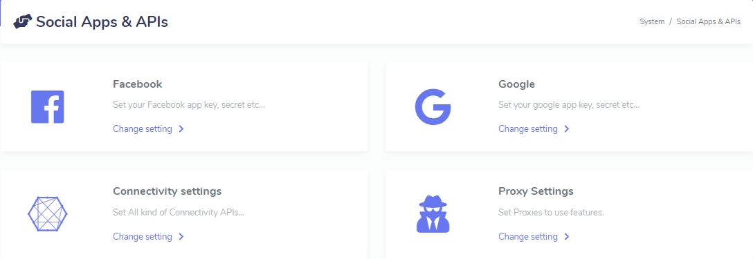 In this section you will see list of all social apps like Facebook, Google also application connectivity settings & proxy settings. This section will help you to customize your social app settings.