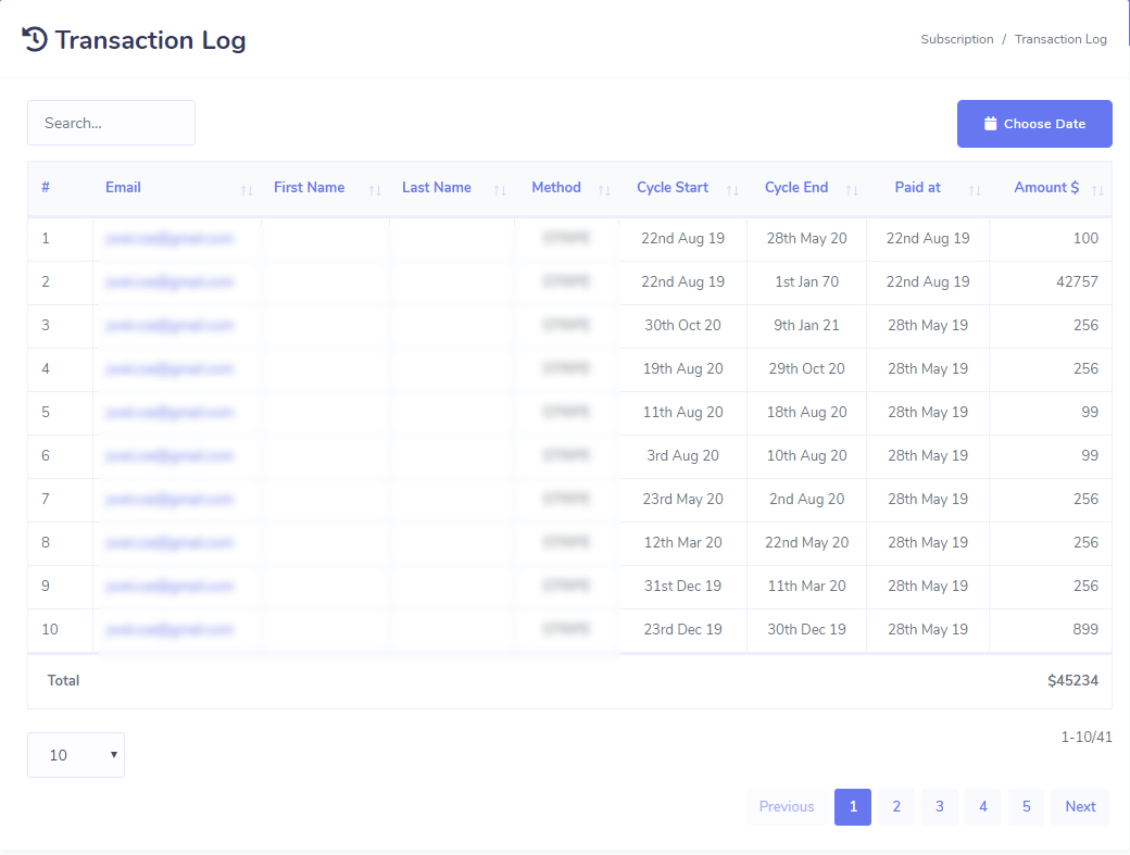 Here you will find all the transaction occured by your users. You can filter your result by choosing the date range by clicking the button placing on the top of the tansaction list named Choose Date