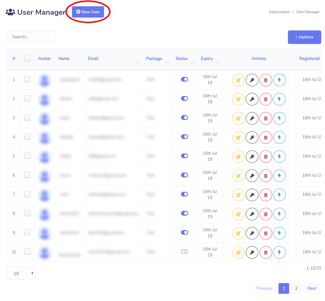 You can add new user by clicking the button New User on the top. When you will click this button you will be redirected on a new page. There you can create a new user by filling the necessary information. You can specify package and expiry date of a user when you create.