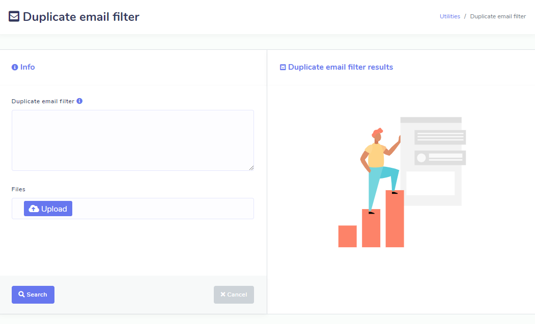 • Just like valid email checker. It searches for unique email ids from a list of emails. Enter list of your emails directly or upload a text file which contains your emails. Hit start searching button. The tool will search for unique email and provide you option to download a csv file which contains all the unique emails from your list.