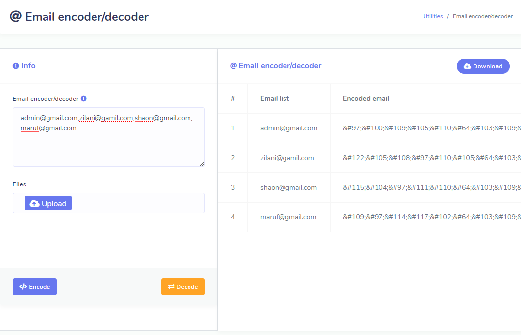 • This form will allow you to encode your e-mail address through the use of Character Entities (https://www.w3.org/TR/REC-html32) , transforming your ascii email address into its equivalent decimal entity. Simply put your email address (Bulk) , Start Encoding, You will get encoded email which can be visible original in browser but in html it will encoded. To prevent from email scraper , this technique is used mostly.