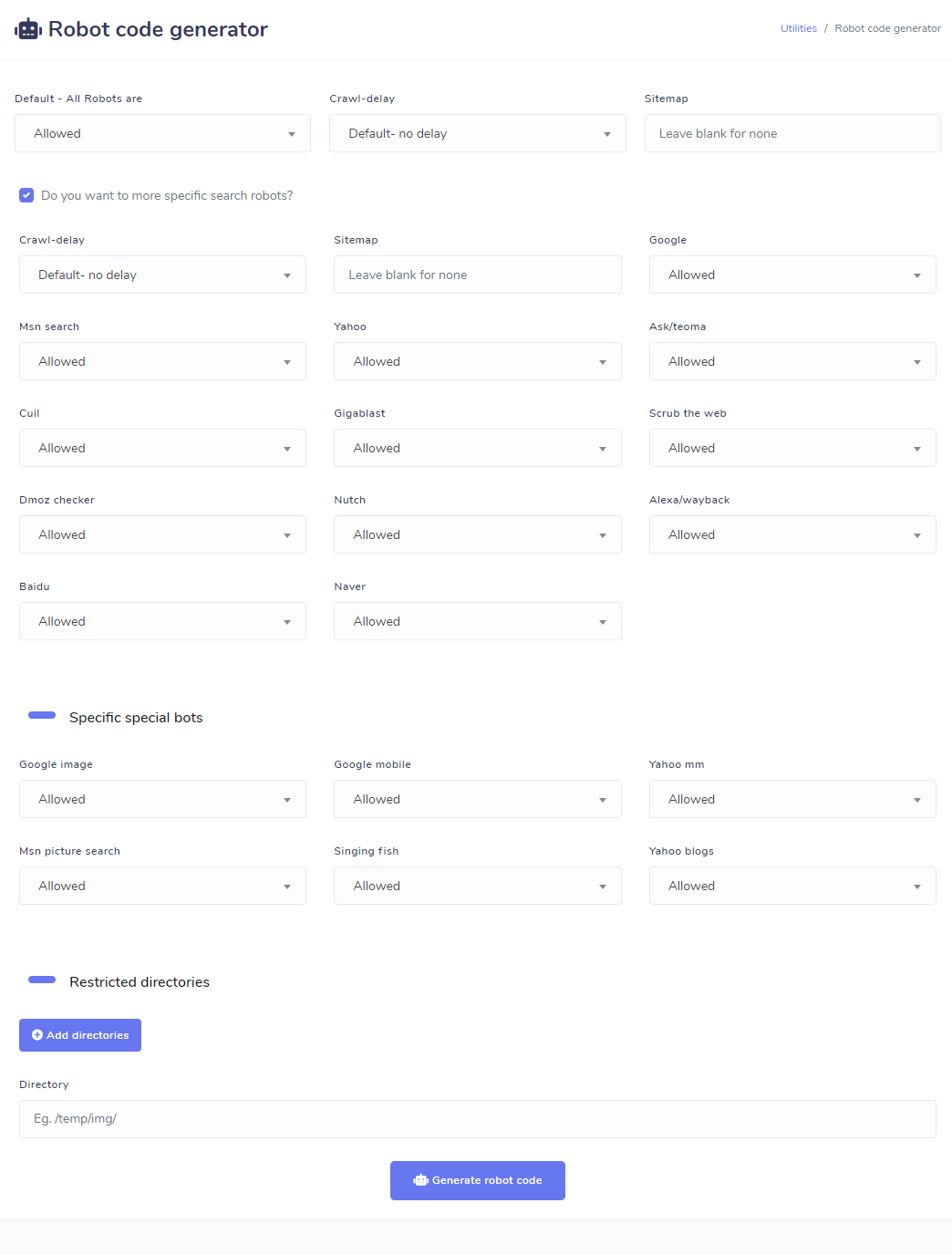 • Our robot code generator is very simple. By clicking robot code generator menu your will get a form. Fill it with suitable data. You can allow all search engine to crawl all your directories of website i.e. full access to your website or full block to your website or you can customize the crawling of search engine by clicking specific search robots. Fill the form properly and click save. A pop up window will come and you will get option to download your robot txt file. Rename it to robots.txt and save it to your website root directory. Please ensure proper permission for robots.txt to read by the search engines.