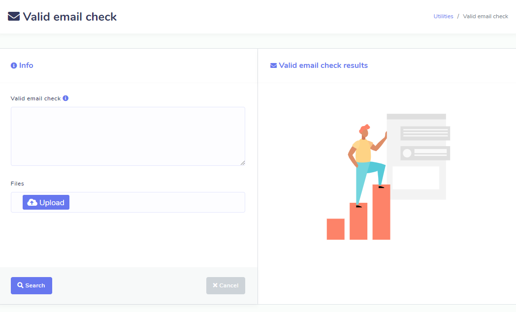• Valid email checker is a tool to check your emails are valid email id or not. You can enter directly list of emails into text field or you can upload a text file which contains the emails. After entering your list or file upload hit start searching button. The tool will check for valid emails in both email format and domain name. After checking a pop up window will come and you can download the valid email list in a csv file by clicking download.